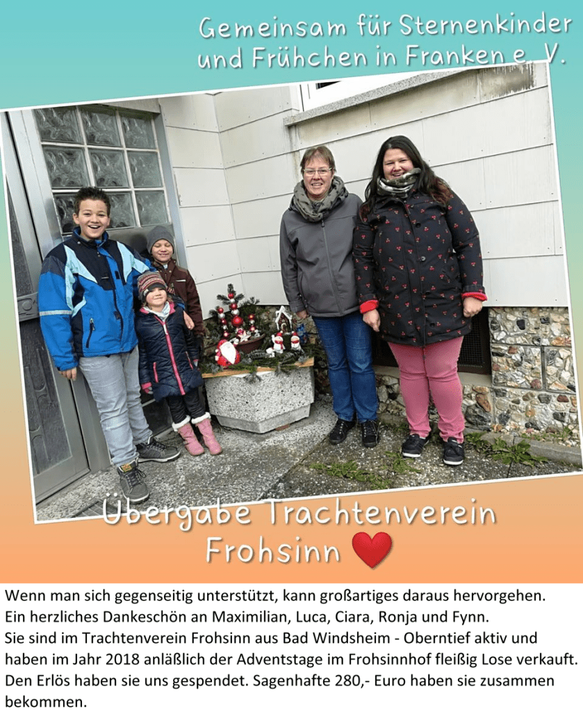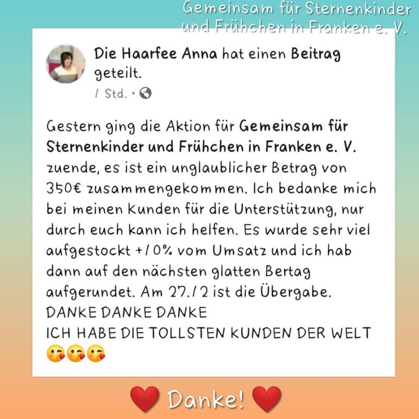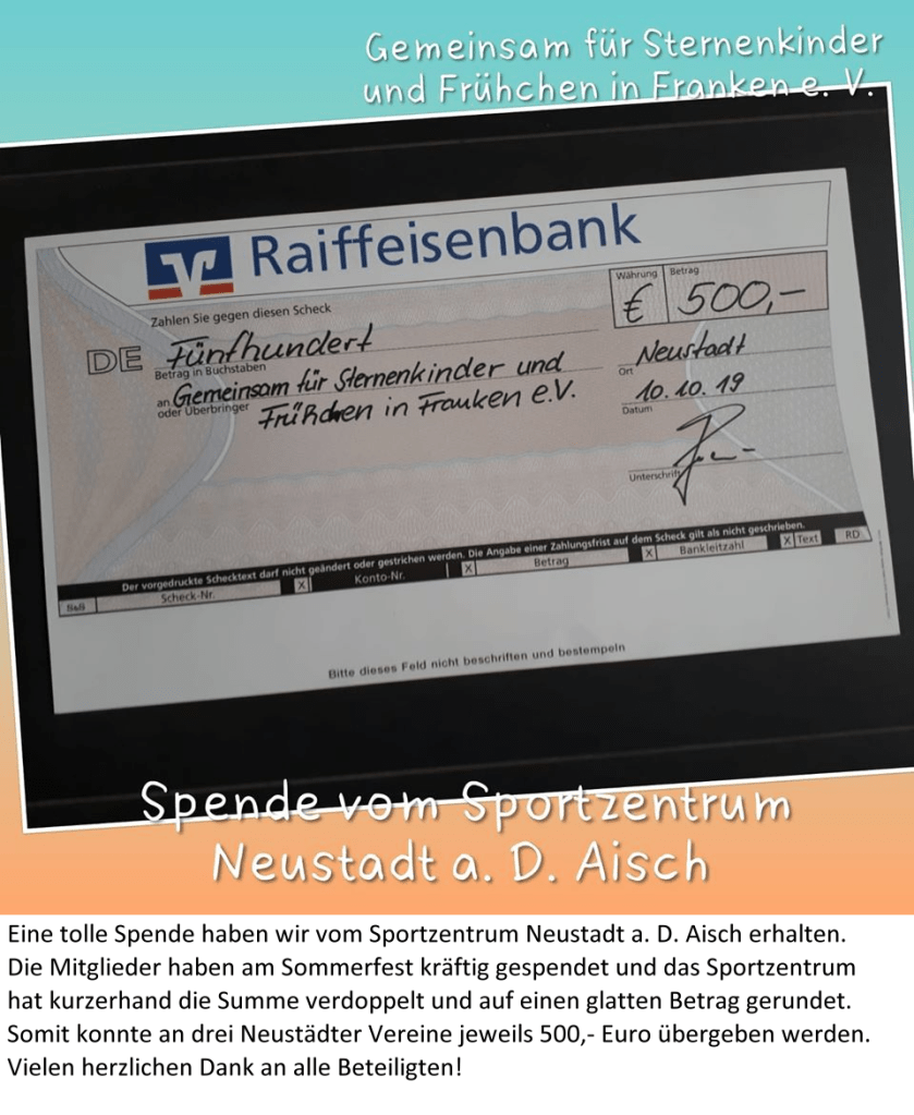 * Unsere Kontodaten: VR meine Bank eG in Neustadt Kontoinhaber: Gemeinsam für Sternenkinder und Frühchen in Franken e. V. IBAN: DE04 7606 9559 0000 2347 70 BIC: GENODEF1NEA